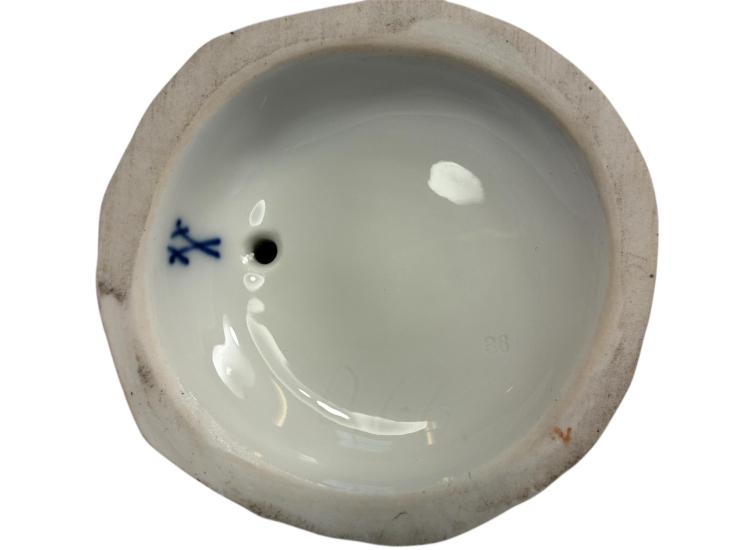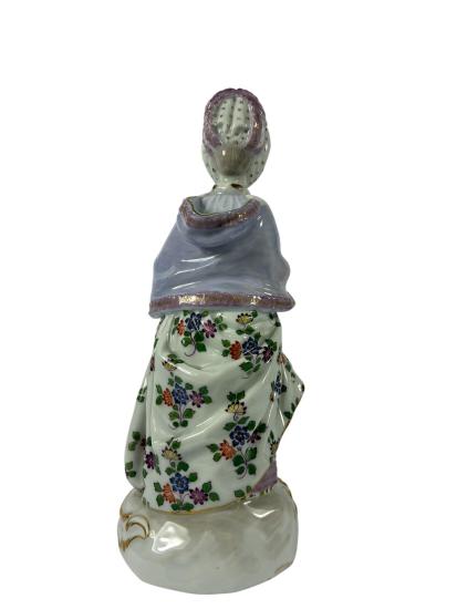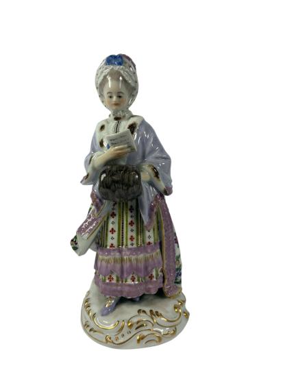 Starožitná porcelánová soška dámy na podstavci. Dáma v rokokoidním účesu a šatech je začtena do kusu popsaného papíru. Zdobení na šatech je detailně provedené. Má na sobě také fialový kabátek s kožešinkou. Soška má na výšku 20 cm a podstavec je široký 8,5 cm. Vespod se nachází znak překřížených šavlí (Míšeňský porcelán,) sériová a výrobní čísla. Miniaturní oťuk na jednom z cípů kabátu.