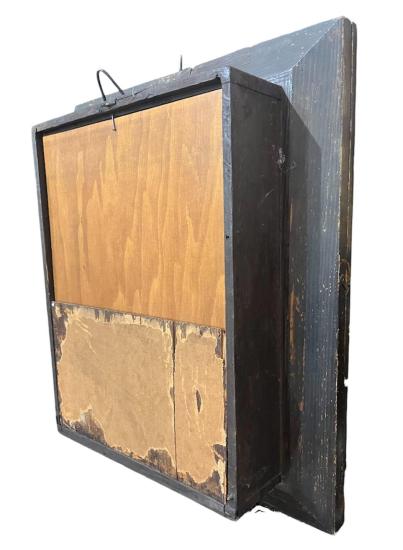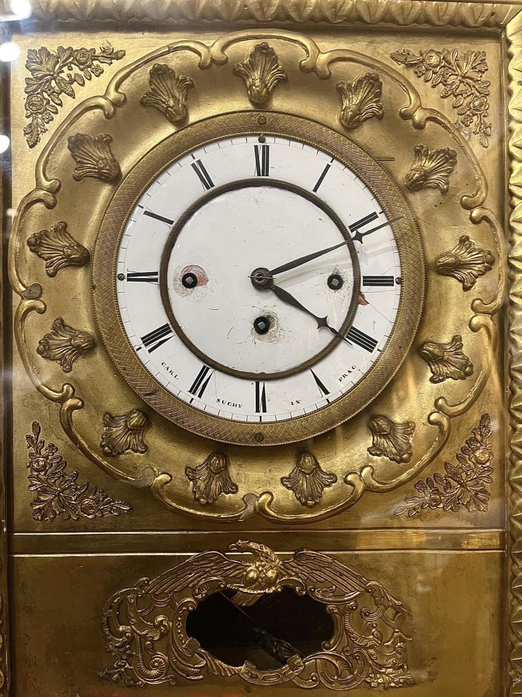 Starožitné rámové hodiny ve stylu Biedermeier. Vnitřek chráněný pod skleněnou deskou je zlacený/ má zlatou barvu. Rozměry rámu jsou 42 x 53 cm. Průměr ciferníku jsou 14 cm. Hloubka je 15 cm. Barva uvnitř je místy ošoupaná. Ciferník má drobné defekty, dřevo je místy ošoupané nebo má oťuky. Jinak v dobrý stav. Neznačeno.