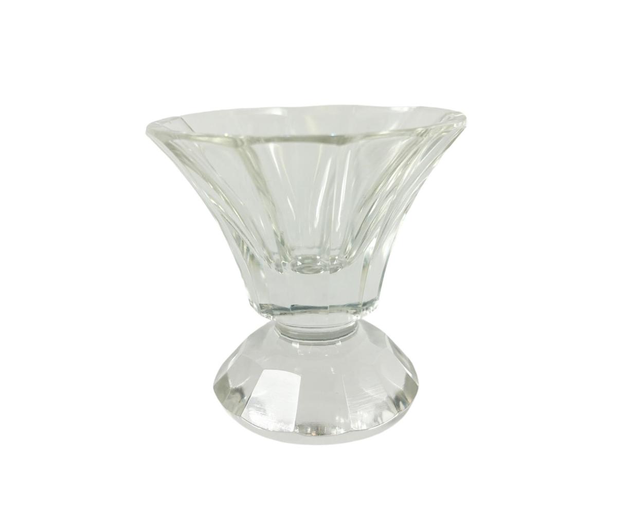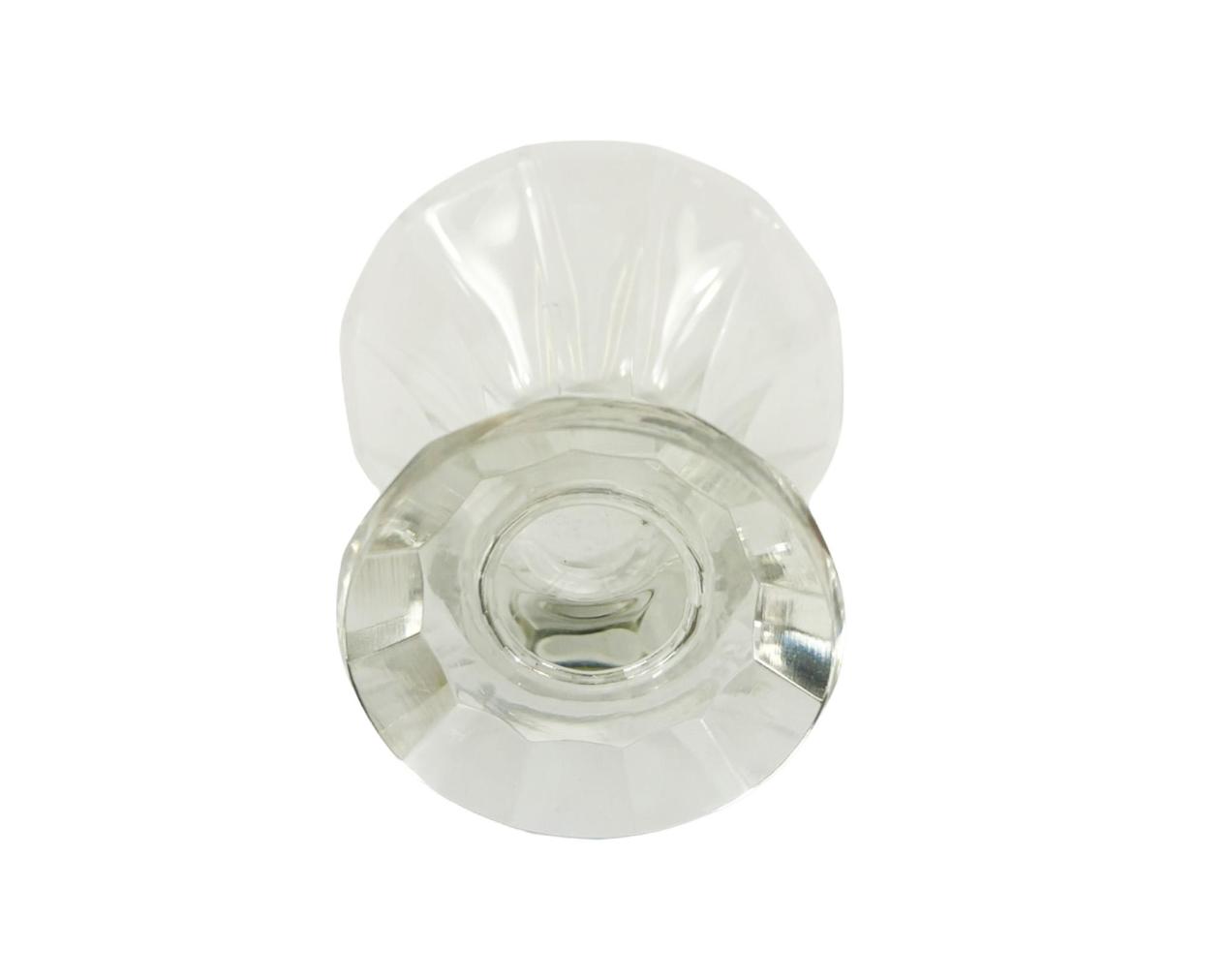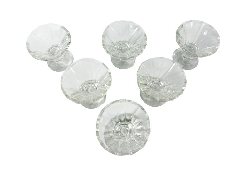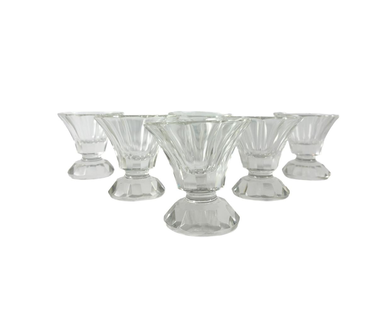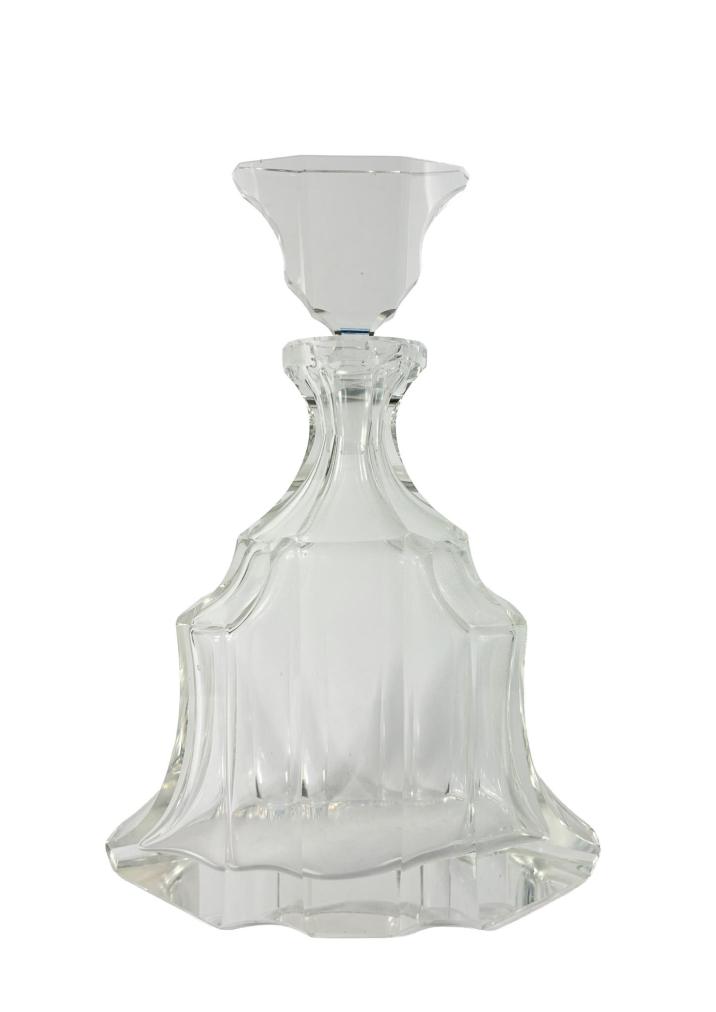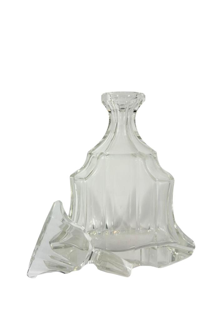 Nádherná likérová sada s karafou a 6 skleničkami v geometrickém provedení. Výška karafy včetně víka 24 cm, vnitřní průměr hrdla 5 cm, vnitřní průměr 3 cm, podstava 16 x 8 cm, výška skleničky 5,5 cm, průměr 5,5 cm, podstava 4 cm. Jedna ze skleniček má velmi drobný oťuk.