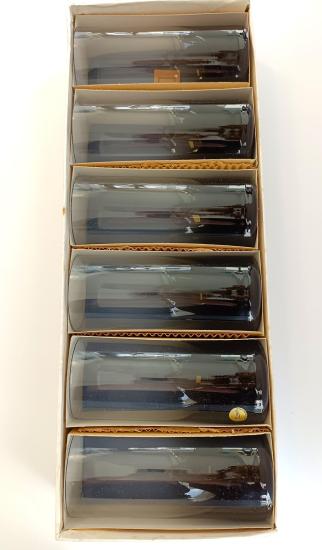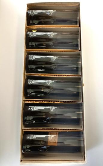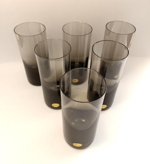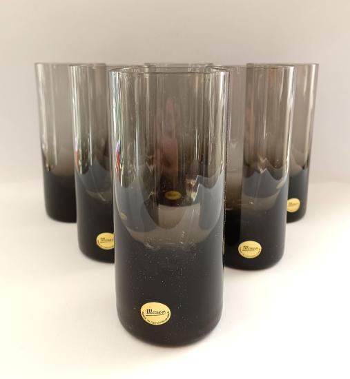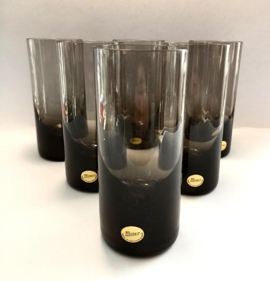 Krásná sada šesti skleniček od značky Moser z křišťálového skla v tmavé šedočerné barvě. Sklenice mají původní samolepku ,,Moser - Made in Czechoslovakia" a jsou uloženy v původní etui. Vše je v perfektním stavu, nepoškozeno. Rozměry: 15,5 x 6,5 cm.