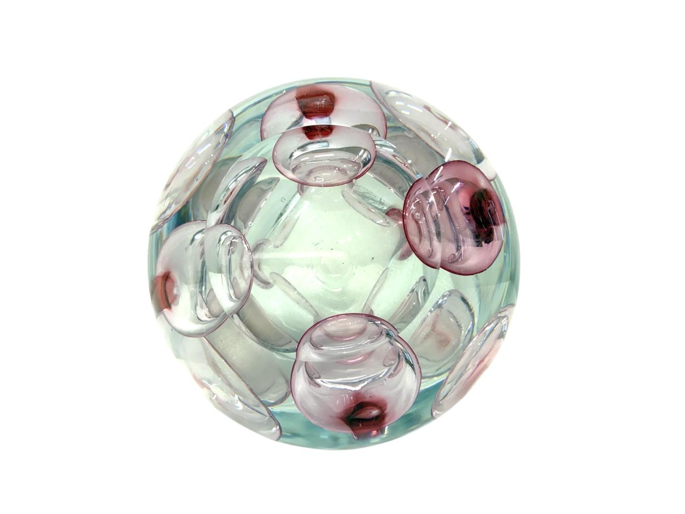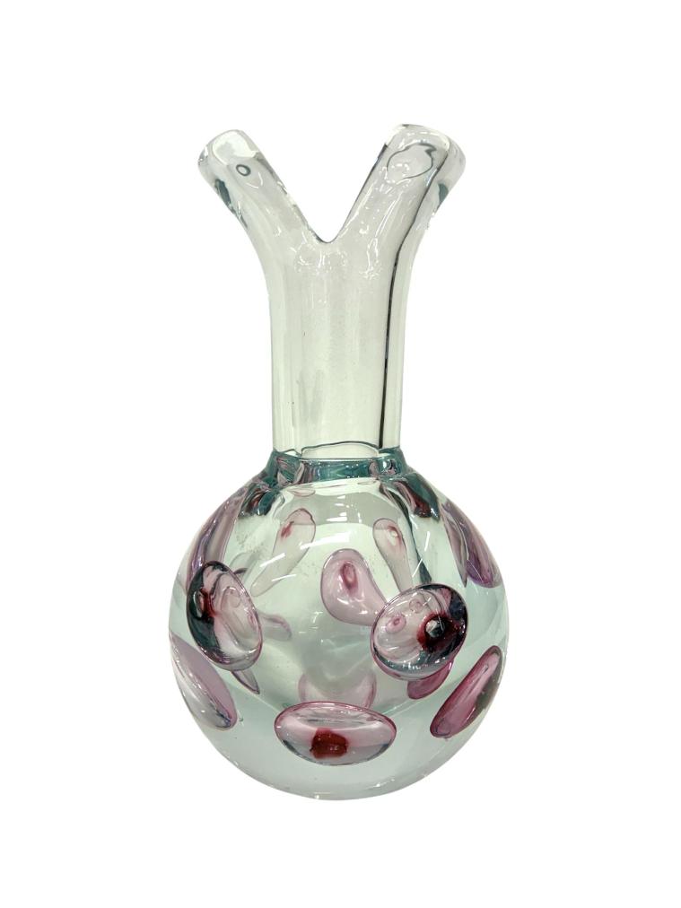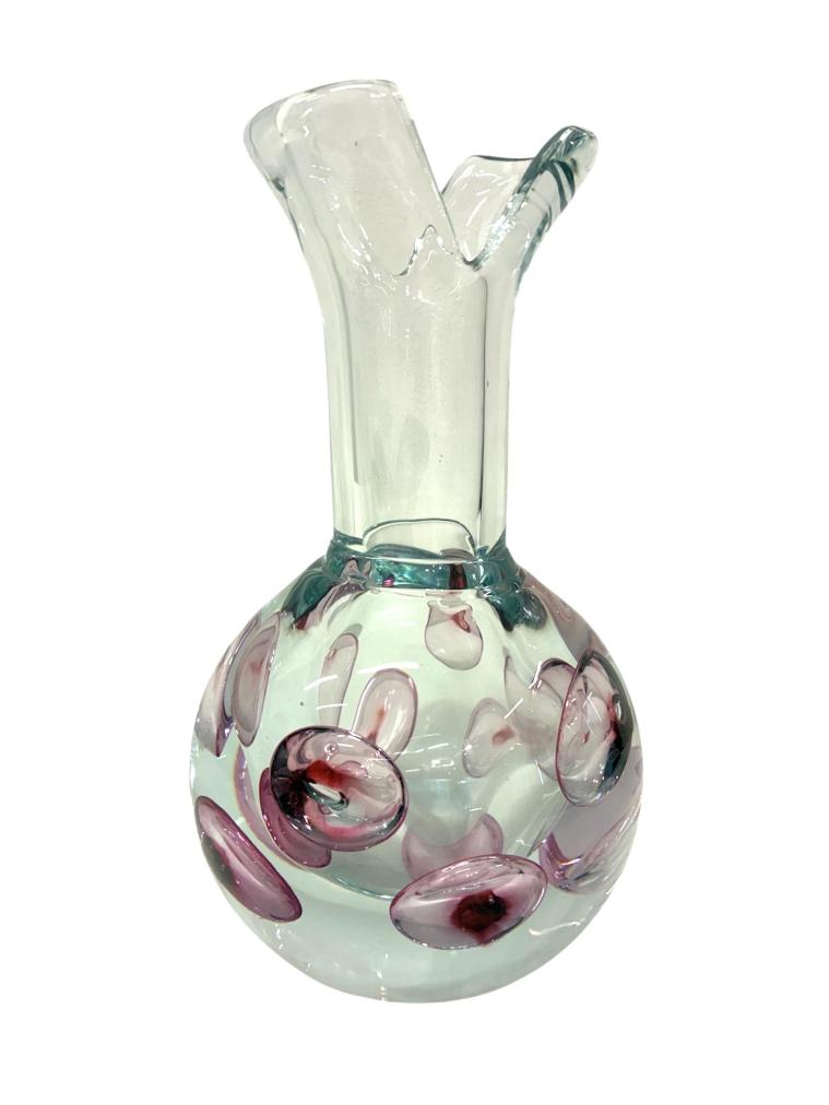 Skleněná váza s růžovými pupenci, které dotváří z různých podhledů zajímavé obrazce. Váza je bez poškození. Na výšku má 25 cm, rozštěpené hrdlo má průměr 10 cm a dno má 7 cm.