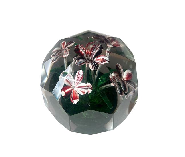 Krásné hranované těžítko z čirého skla se zatavenými, červeně žíhanými květy. Výška 9 cm, průměr podstavy 6 cm. Ošoupaná podstava s jemnými rýhami, jinak bez poškození v perfektním stavu.
