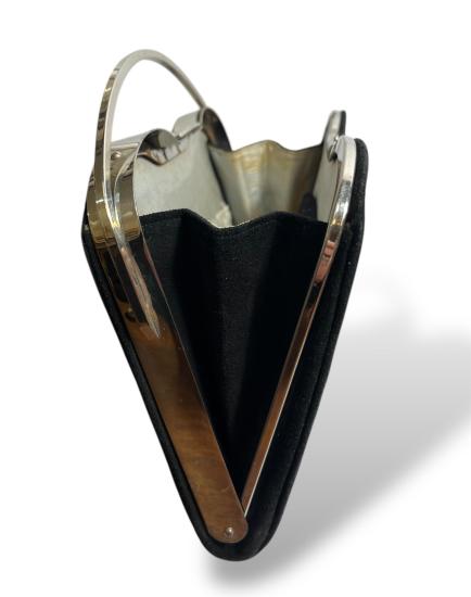 Pěkná starožitná kabelka v černém semišovém provedení a kovovými detaily, díky minimalistickému stylu je její design nadčasový. Kabelka uvnitř obsahuje ještě malou peněženku. Semiš, textilie a kov, výška 20,5 cm, v nejširším bodě 21 cm. V perfektním stavu jen v jednom místě je kov lehce zarezlý, uvnitř místy skvrny viz foto.