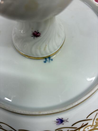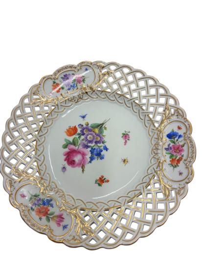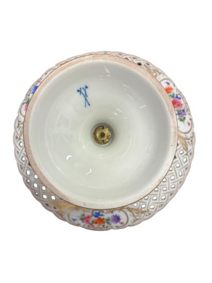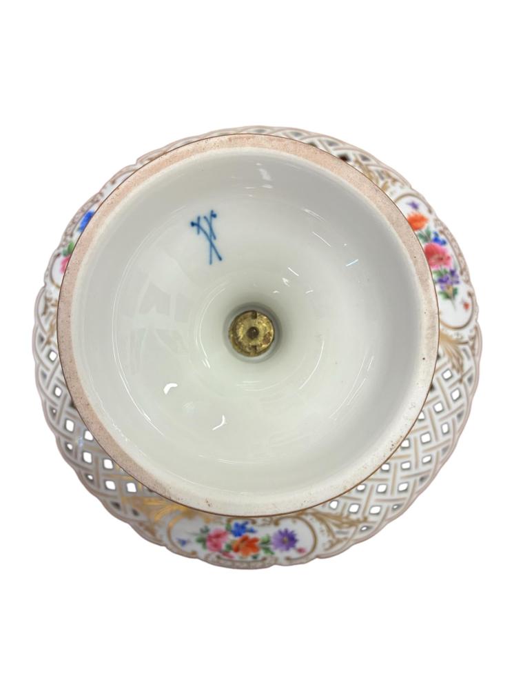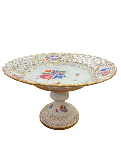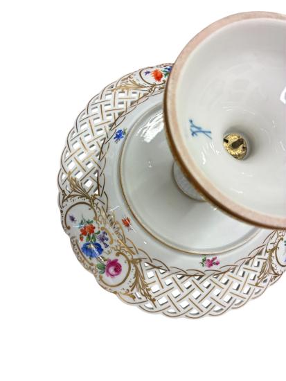 Typický kus míšeňského porcelánu s květinovými motivy a okraji s dojmem proutěnného košíku se zlacením. Mísa je na zdobeném podstavci též stejného zdobení. Výška je 15 cm a průměr vrchního talíře je 23 cm. Oba dva kusy jsou spojeny šroubkem v podstavci a každý z nich je označen dvěma překříženými meči.
