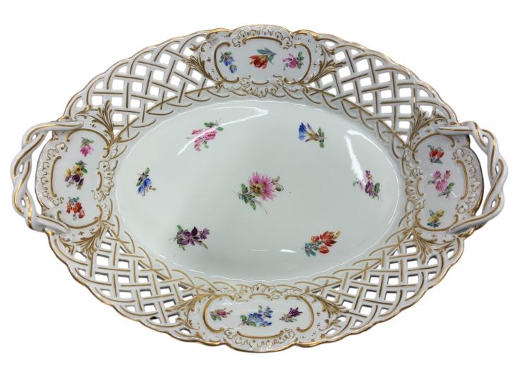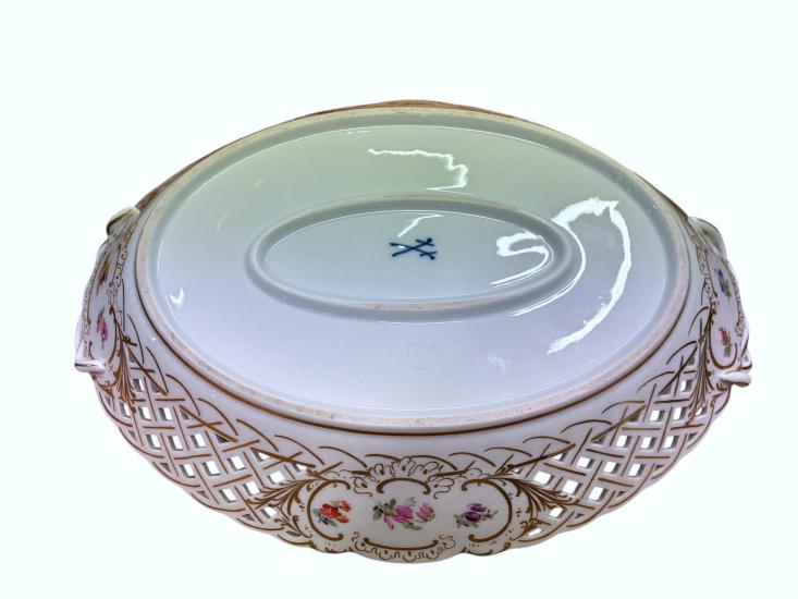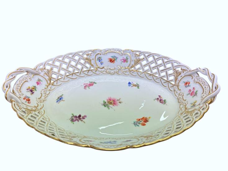 Starožitná mísa s drobnými květinovými motivy a zlacenými okraji dodávající dojem proutěného košíku. Po stranách delší části se nachází dvě ala proutěné ucha pod nimiž se v erbech nachází též motivy jarních květin. Průměr delší strany je 30 cm a kratší strany je 21 cm. Na výšku má 4,5 cm. Perfektní stav, značeno zkříženými meči - Míšeň.