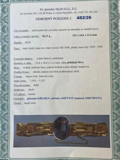 Krásný starožitný náramek ze zlata 585/1000 s puncem lvíček, 1. republika. Váha 26,11 g. Kombinace žlutého zlata s bílými detaily. Šířka náramku 14 mm, délka náramku cca 17,5 cm (+/- pár milimetrů, přesné proměření není možné vzhledem k pojistnému řetízku) rozměry ametystu jsou 25 x 19 mm, tloušťka/ hloubka je 11 mm. Kámen - přírodní ametyst oválného smíšeného brusu - 1 ks, cca 30 ct.