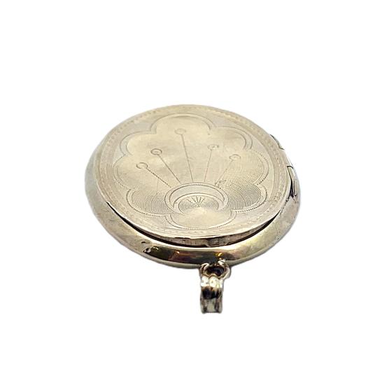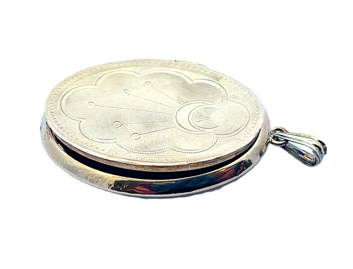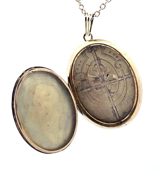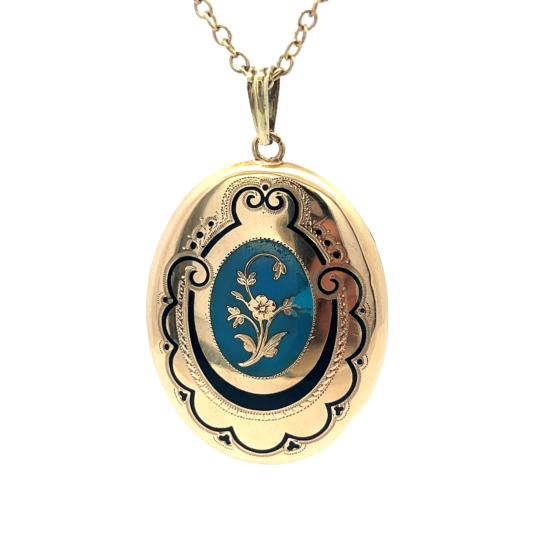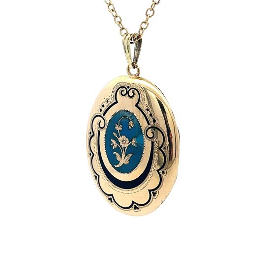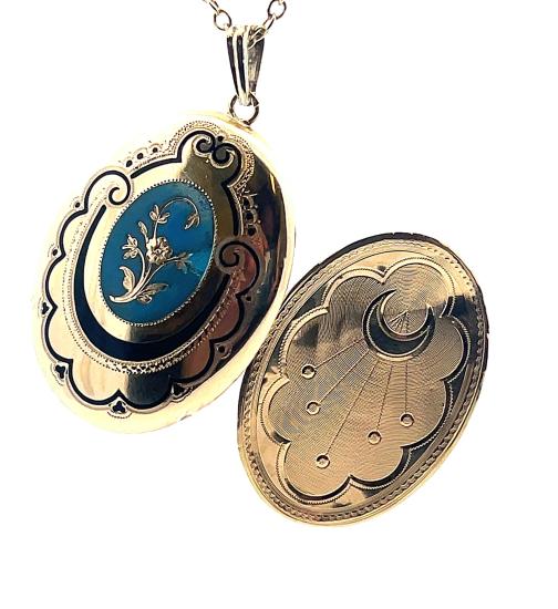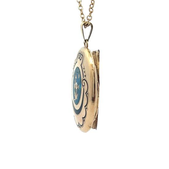Zlatý medailon o ryzosti 585/1000, punc AW (Z-29 - punc používaný od roku 1902). Váha 5,98 g, výška včetně očka 44,5 mm, v nejširším bodě 27 mm. Modrý email je v jednom místě poškozený, viz foto. Vzhledem k charakteru a stáří šperku je zlato na šperku místy promáčknuté.