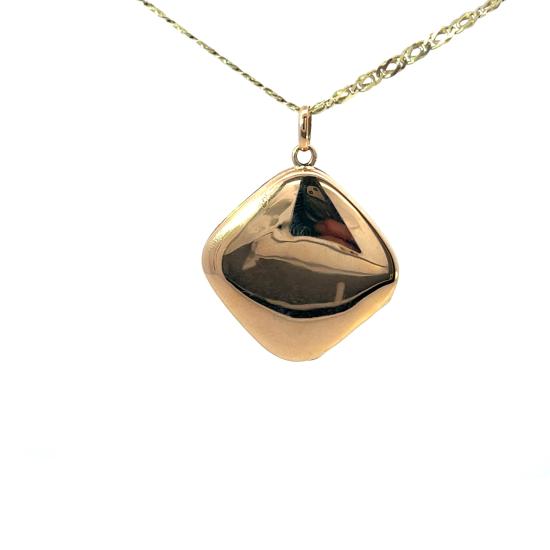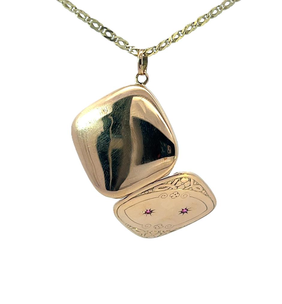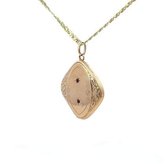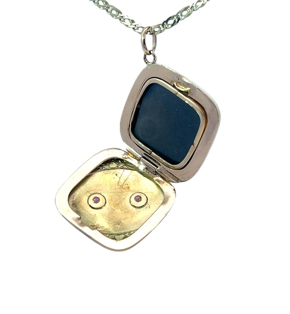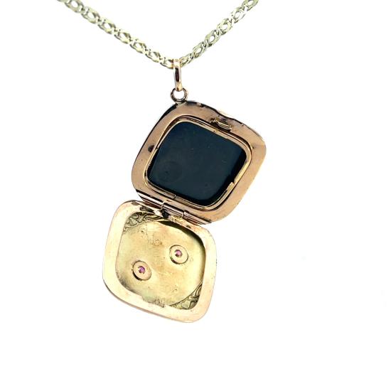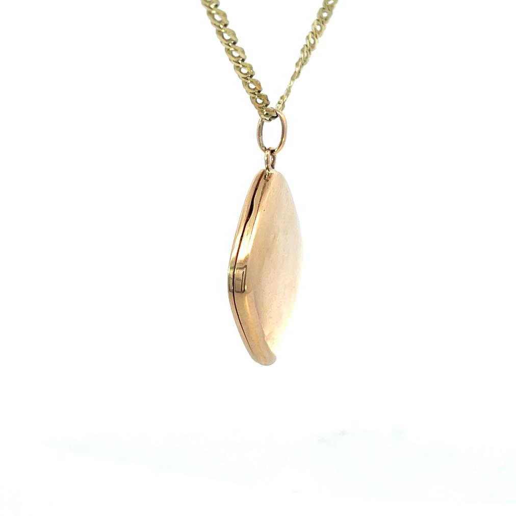 Medailon z růžového zlata o ryzosti 585/1000, punc AW (Z-29 - punc platný od r. 1902). Váha 4,84 g, výškavčetně očka 38 mm, v nejširším bodě 29 mm. Kameny jsou syntetické. Na zadní straně je mělká prohlubeň, viz foto. Zlatý rámeček uvnitř má dvě praskliny.