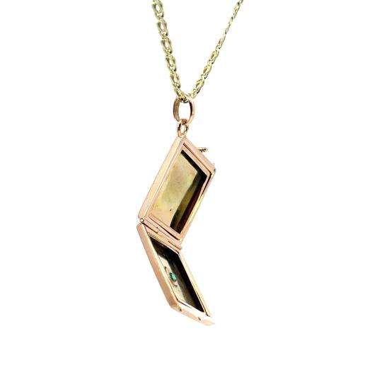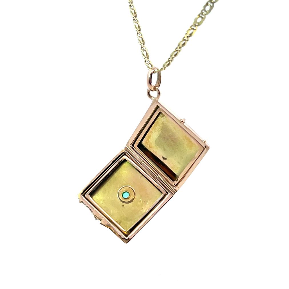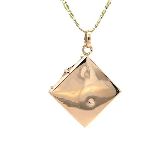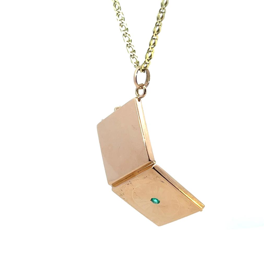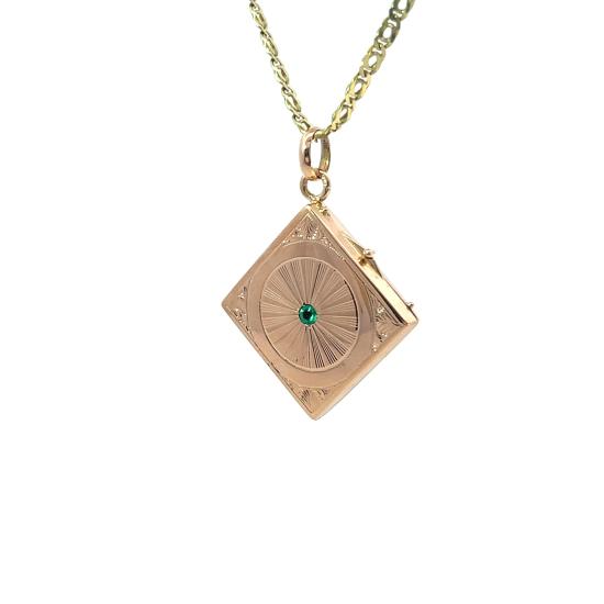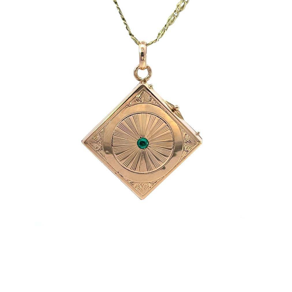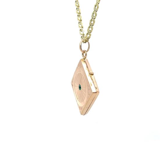 Medailon z kombinace žlutého a růžového zlata o ryzosti 585/1000, punc AW (Z-29 - punc platný od r. 1902). Váha 4,44 g, výška včetně očka 38 mm, v nejširším bodě 29,5 mm. Kámen je syntetický. Medailon má na zadní straně v jednom místě promáčknutí - viz foto.