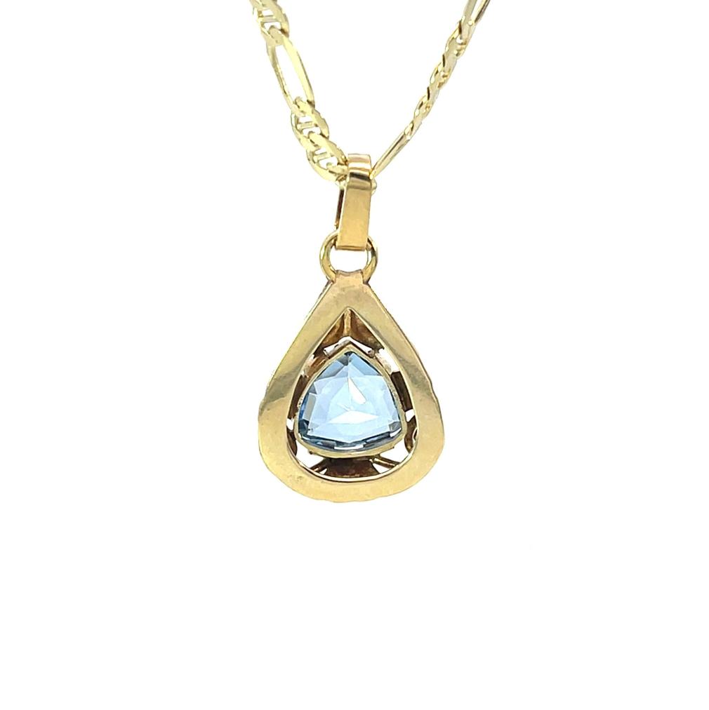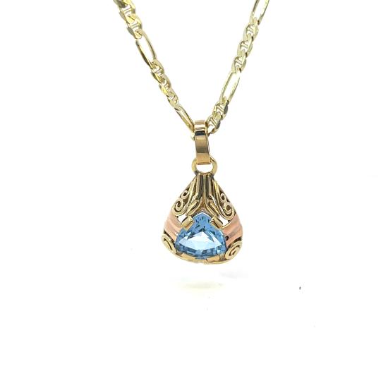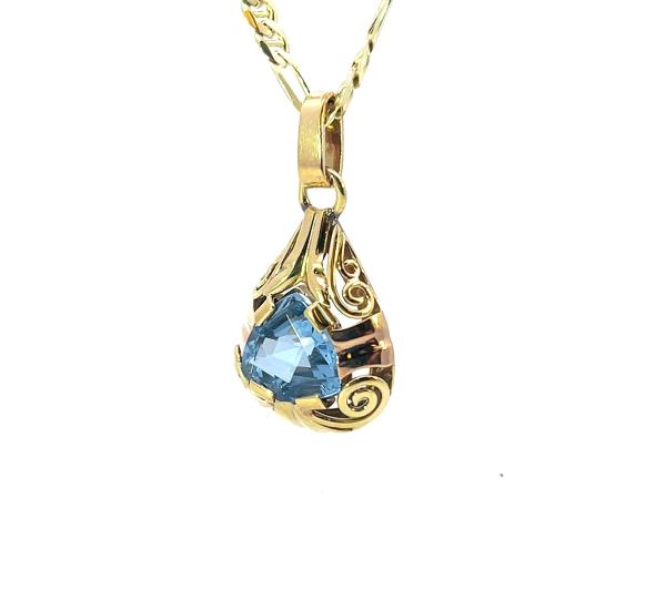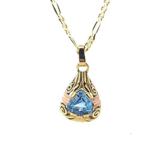 Přívez z kombinace žlutého a růžového zlata o ryzosti 585/1000, punc labuť. Váha 2,88 g, výška včetně očka 28 mm, v nejširším bodě 15 mm. Kámen je syntetický. Řetízek není součástí nabídky.