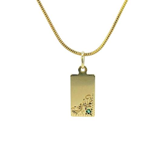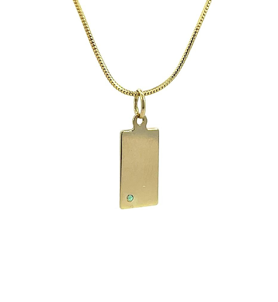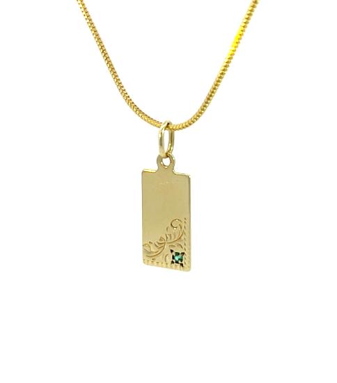 Zlatý přívěs o ryzosti 585/1000, punc labuť. Váha 1,03 g, výška včetně očka 23 mm, v nejširším bodě 8 mm. Kámen je syntetický.