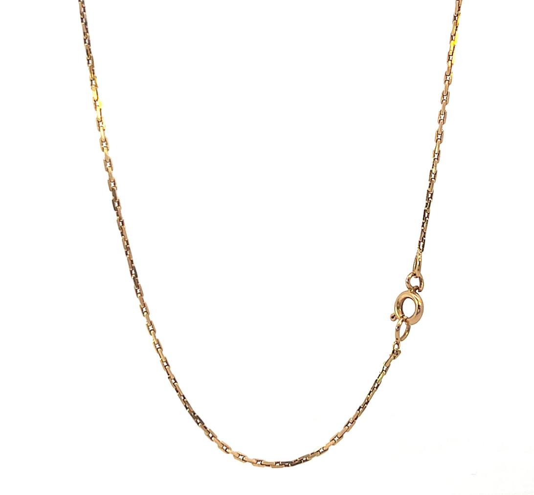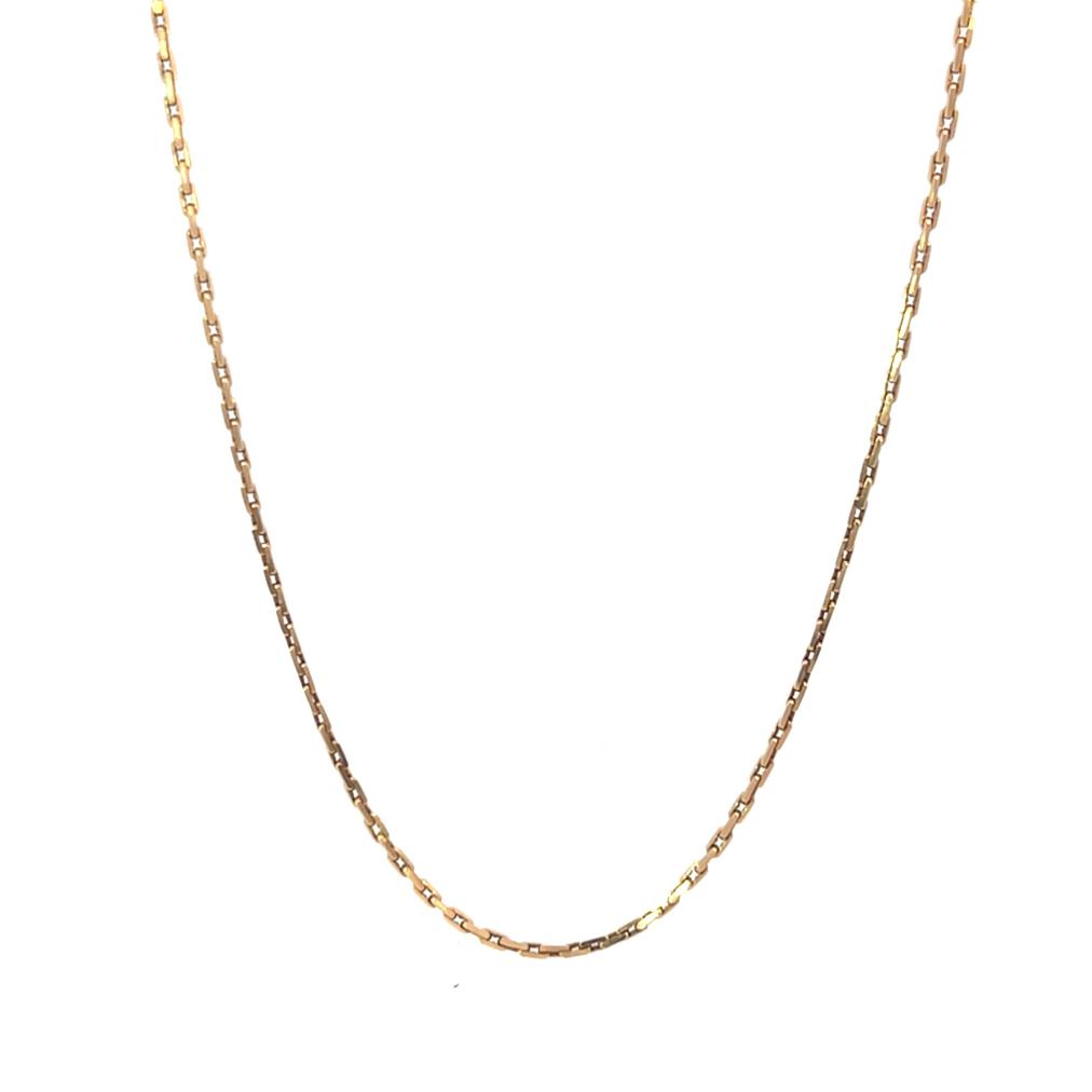 Řetízek z růžového zlata o ryzosti 585/1000, punc labuť. Váha 4,45 g, délka 52,5 cm, v nejširším bodě 1,5 mm.