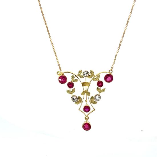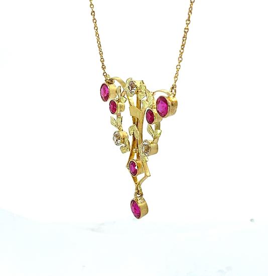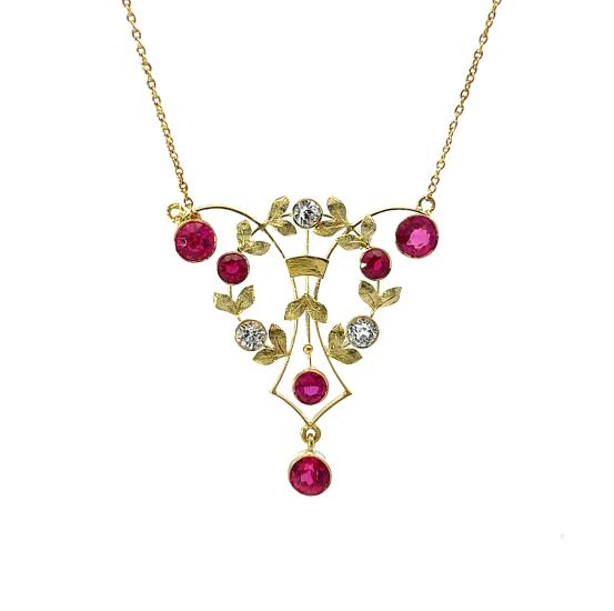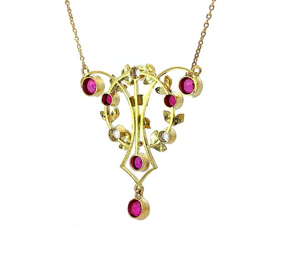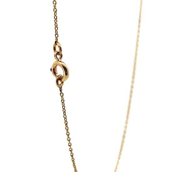 Zlatý kolier o ryzosti 580/1000, punc liška. Váha 5,44 g, délka řetízku 45 cm, výška přívěsu 37 mm, v nejširším bodě 32 mm. Kameny jsou syntetické.