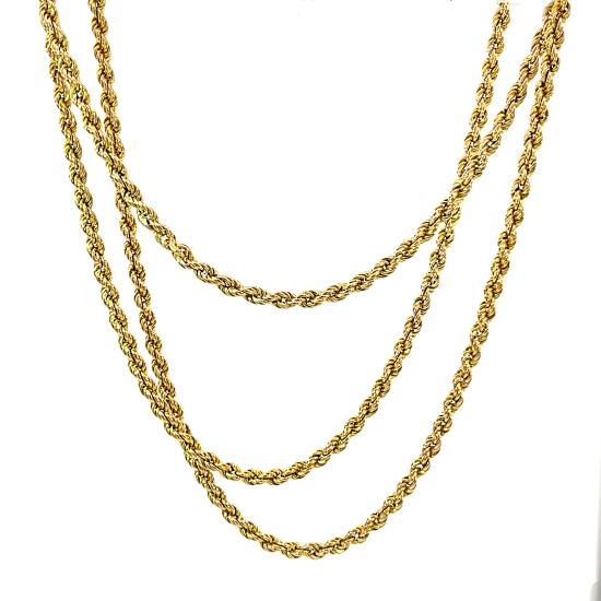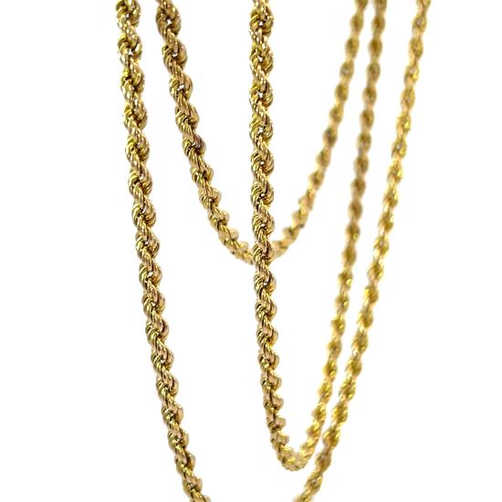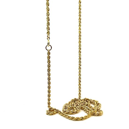 Zlatý řetízek o ryzosti 580/1000, punc liška. Váha 11,34 g, délka 80,5 cm, v nejširším bodě 3 mm. Očko na zapínání je v růžovém zlatě.