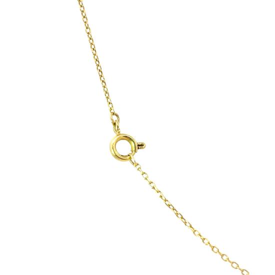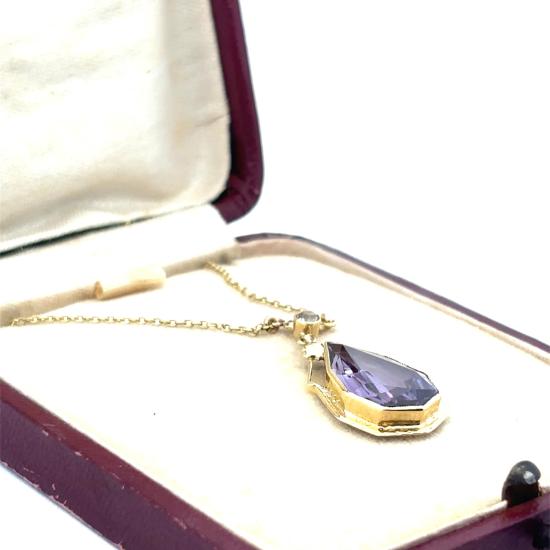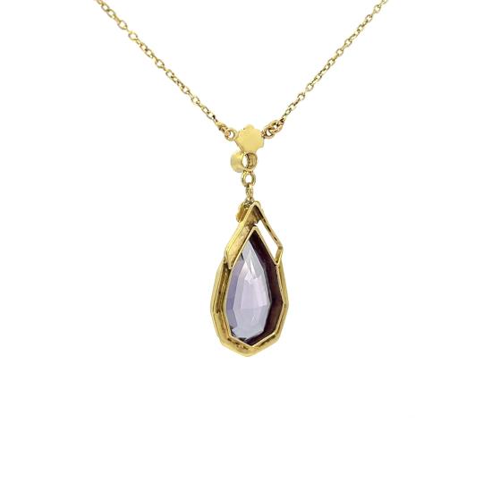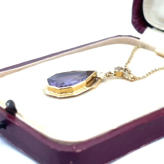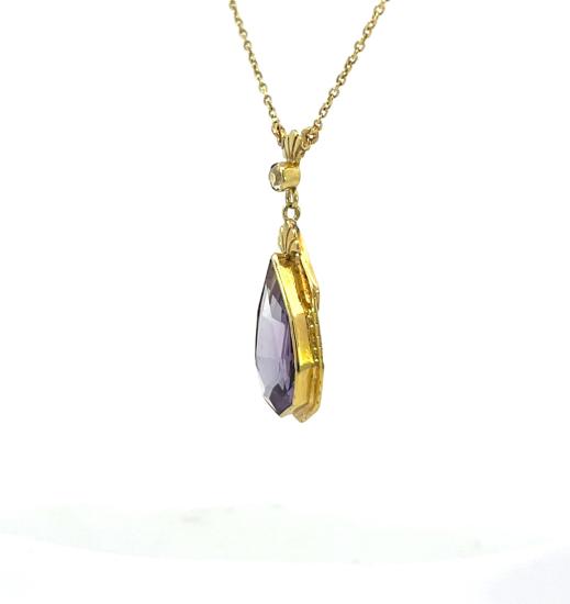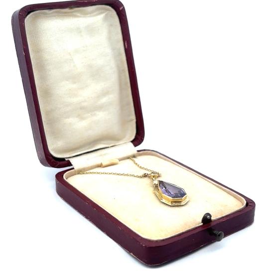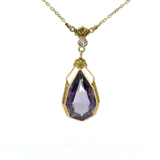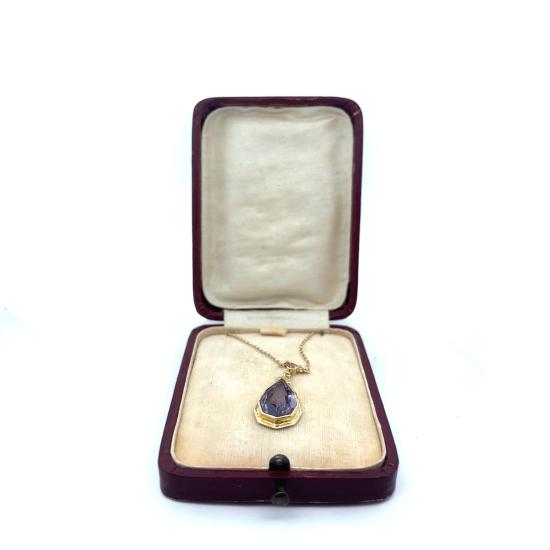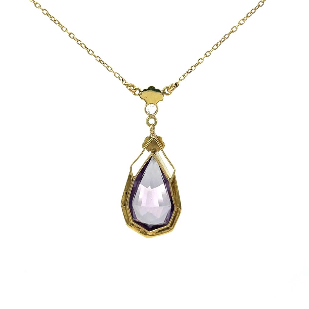 Zlatý kolier o ryzosti 585/1000, punc čejka. Váha 5,58 g, délka 46,3 cm, výška přívěsu 37 mm, v nejširším bodě 14 mm. Kameny jsou syntetické, fialový kámen je syntetický korund.