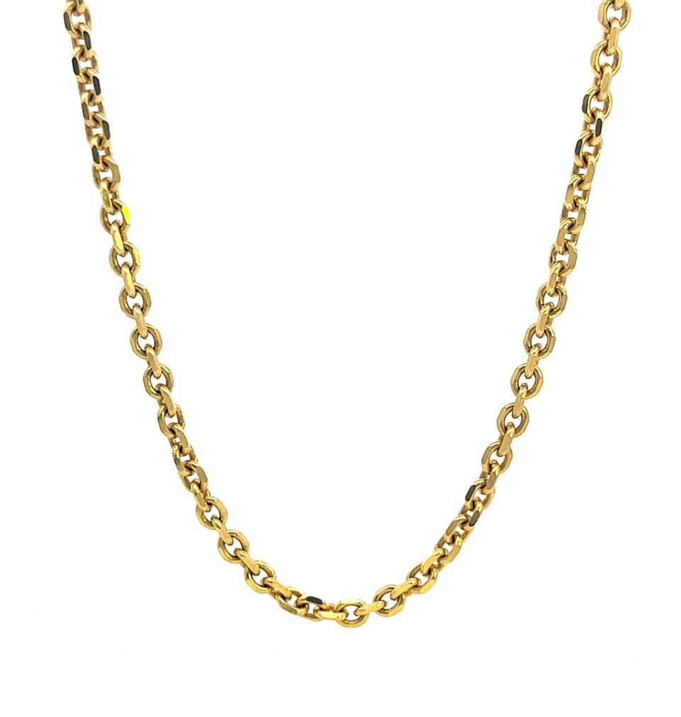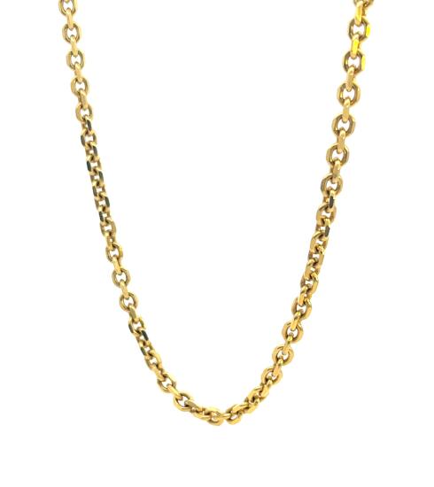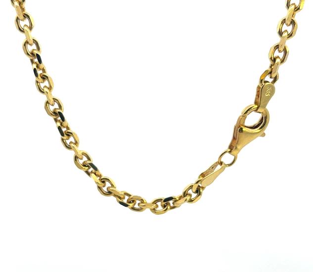Zlatý řetízek o ryzosti 585/1000, punc labuť. Váha 16,24 g, délka 45,3 cm, v nejširším bodě 4 mm.