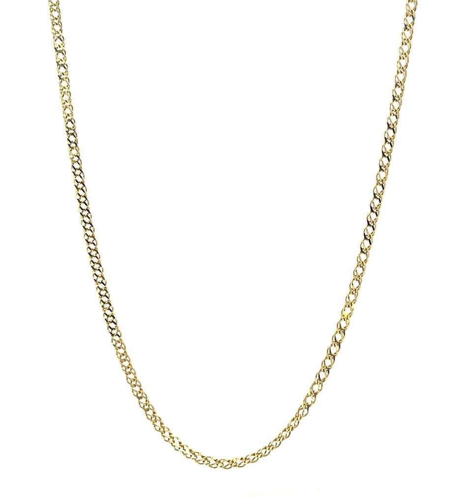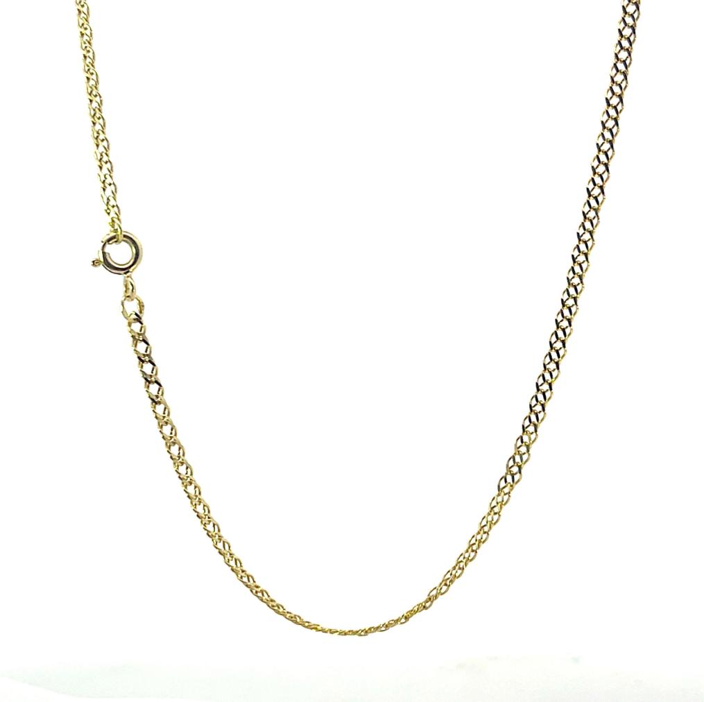 Zlatý řetízek o ryzosti 585/1000, punc labuť. Váha 3,68 g, délka 50 cm, v nejširším bodě 2 mm.
