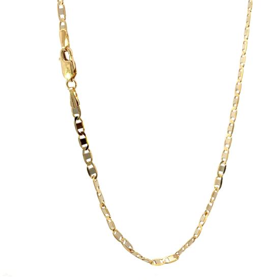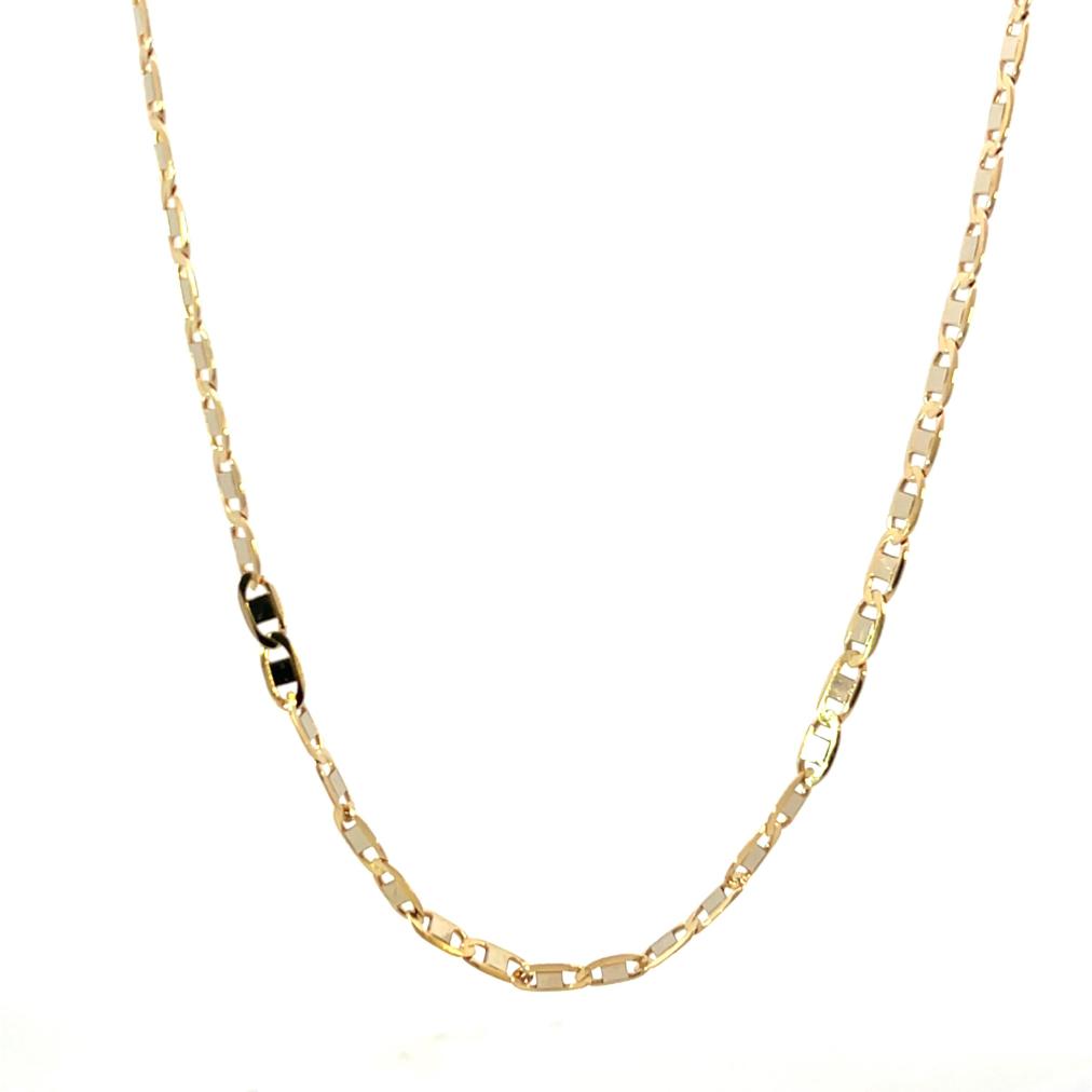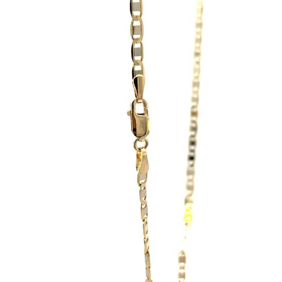 Řetízek z kombince žltuého a bílého zlata o ryzosti 585/1000, punc labuť. Váha 5,90 g, délka 45,5 cm, v nejširším bodě 3 mm.